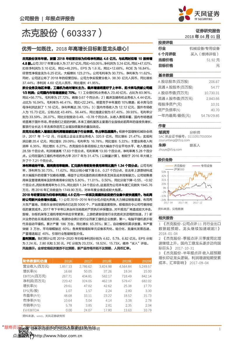 天风证券*公司研究*优秀一如既往,2018年高增长目标彰显龙头雄心!--杰克股份(603337)公司报告年报点评报告 1 杰克股份(603337) 证券研究报告2018年04月01日投资评级行业机械设备/专用设备6个月评级买入(维持评级) 当前价格51.92元目标价格 元基本数据A股总股本(百万股) 206.67 流通A股股本(百万股) 54.77 A股总市值(百万元) 10,730.31 流通A股市值(百万元) 2,843.66 每股净资产(元) 10.31 资产负债率(%) 40.70 一年内最高/最低(元) 54.78/29.85 作者 邹润芳分析师SAC执业证书编号:S04 朱晔联系人 资料来源:贝格数据相关报告1 《杰克股份-公司点评:11月行业出口数据超预期,龙头继续加速崛起!》 2018-01-04 2 《杰克股份-季报点评:三季度同比增速继续上升,国内工缝龙头逐步迈向国际巨头》 2017-10-31 3 《杰克股份-半年报点评:收入超预期增长印证龙头逻辑,利润增速短期受累成本、汇率影响》 2017-09-04 股价走势优秀一如既往,2018年高增长目标彰显龙头雄心! 杰克股份发布年报,披露2018年经营目标为归母净利润达4.6亿元,与此同时拟每10股转增4.8股。